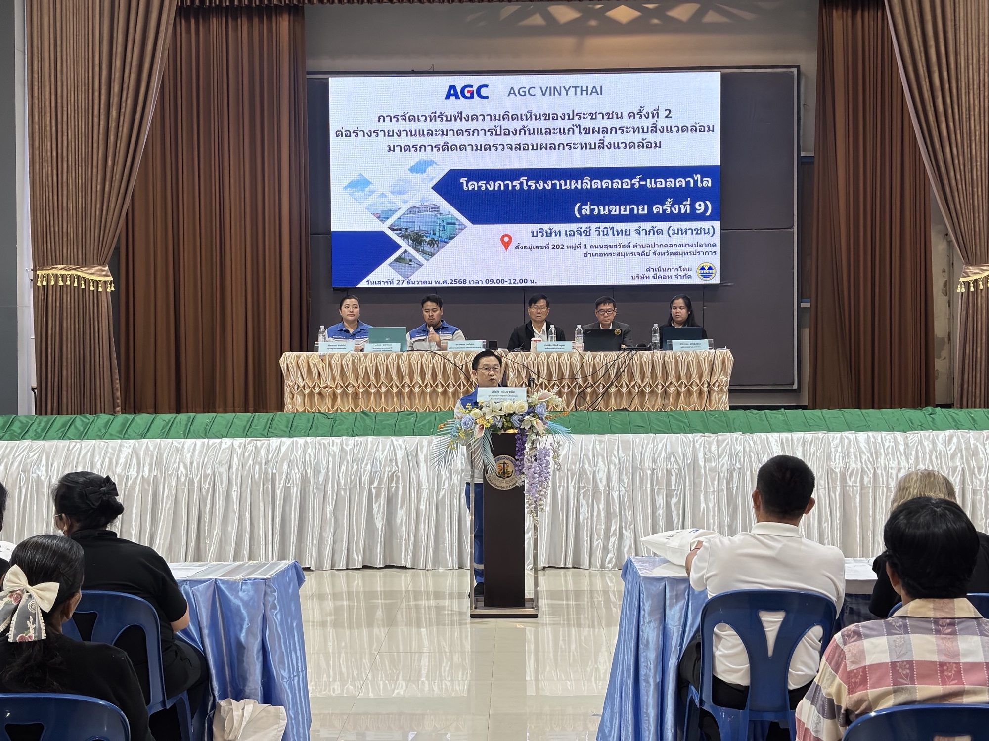 On December 27, 2025, AGC Vinythai Public Company Limited, Phra Pradaeng Plant, conducted the 2nd Public Hearing for the Chlor-Alkali Plant Project (9th Expansion). The meeting held at the Pomnakarachsawatyanon School Auditorium in Samut Prakan Province, aimed to provide stakeholders with an opportunity to exchange views and offer suggestions regarding the project.