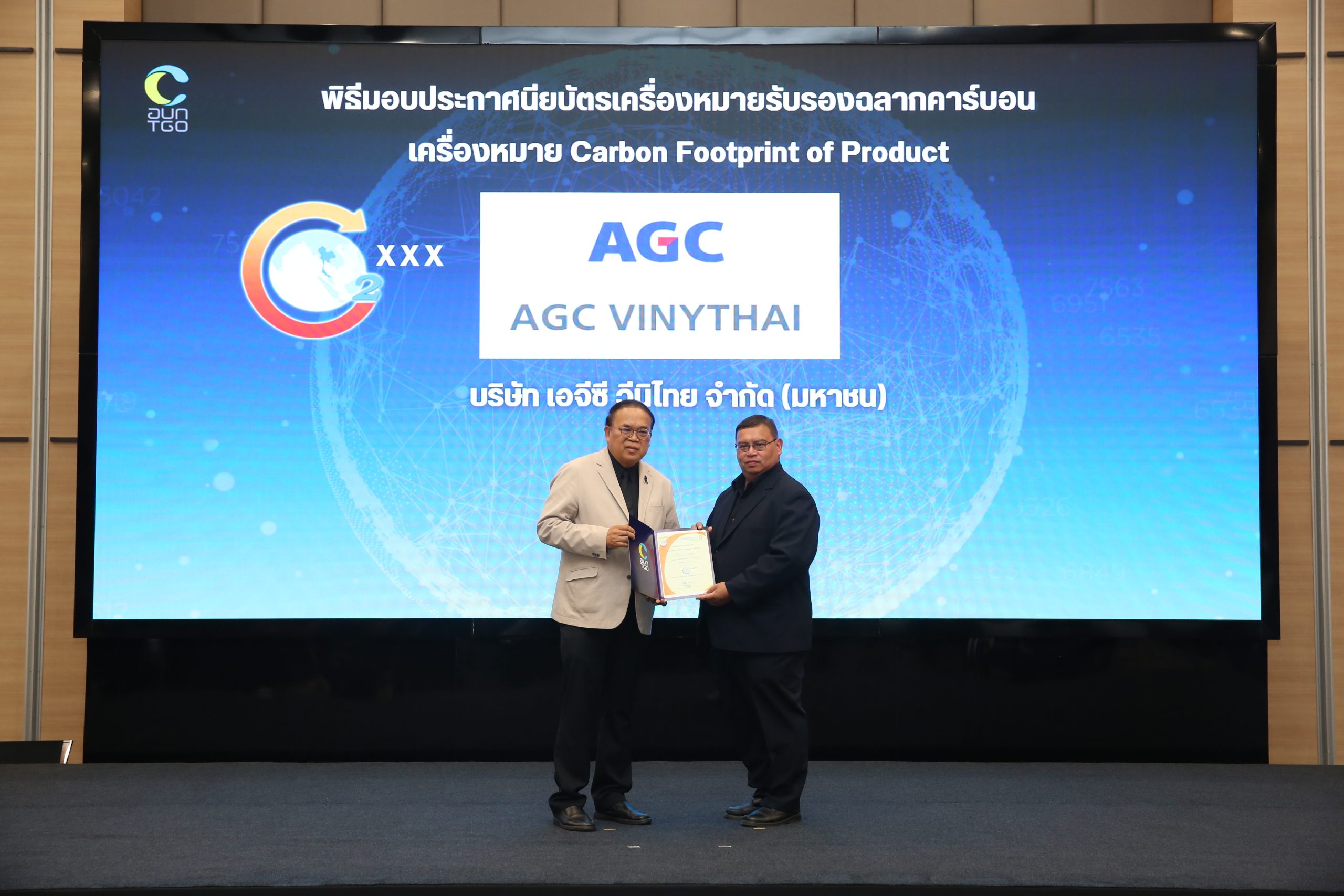 โดยผลิตภัณฑ์ของเอจีซี วีนิไทย โรงงานมาบตาพุด 2 ที่ได้รับการรับรองเครื่องหมายคาร์บอนฟุตพริ้นท์ (Carbon Footprint of Products) ได้แก่ ผลิตภัณฑ์โซดาไฟ (ชนิดเม็ด) ความบริสุทธิ์ไม่น้อยกว่า 99% และโพแทสเซียมคาร์บอเนต ความบริสุทธิ์ไม่น้อยกว่า 99% ซึ่งการได้การรับรองในครั้งนี้ สะท้อนถึงเจตนารมณ์ของบริษัทฯ ในฐานะภาคเอกชนที่มีบทบาทสำคัญในการควบคุมและลดการปล่อยก๊าซเรือนกระจกจากกระบวนการผลิตอย่างเป็นรูปธรรม เพื่อยกระดับขีดความสามารถในการแข่งขันระยะยาว และขับเคลื่อนองค์กรสู่เป้าหมายการปล่อยก๊าซเรือนกระจกสุทธิเป็นศูนย์ (Net Zero) ภายในปี 2593